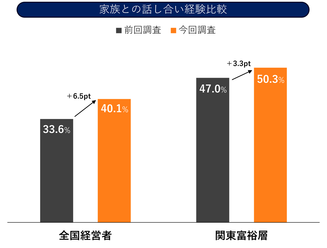 家族との話し合い経験は、全国経営者で 40.1%(+6.5pt)、関東富裕層で 50.3%(+3.3pt) と前回調査から増加しました。コミュニケーション面で前進は見られるものの、依然として半数近くが話し合い未経験であり、心理的抵抗や情報開示への不安が課題となっています。